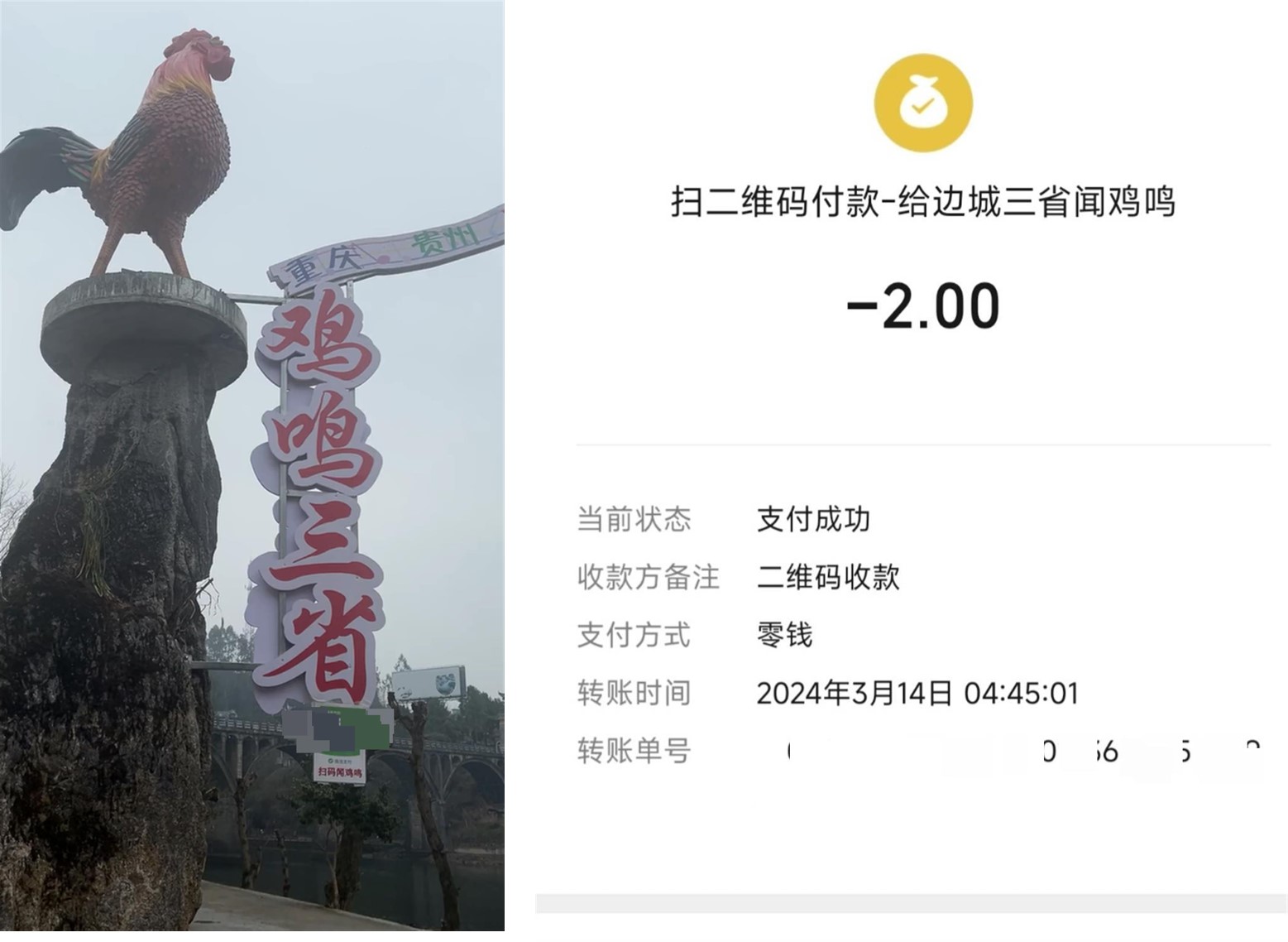 最近網上有個娛樂事件:在重慶、貴州、湖南三地交界的邊城,一農家樂門口安放了一只公雞雕塑,并懸掛二維碼,游客掃碼支付二元后...